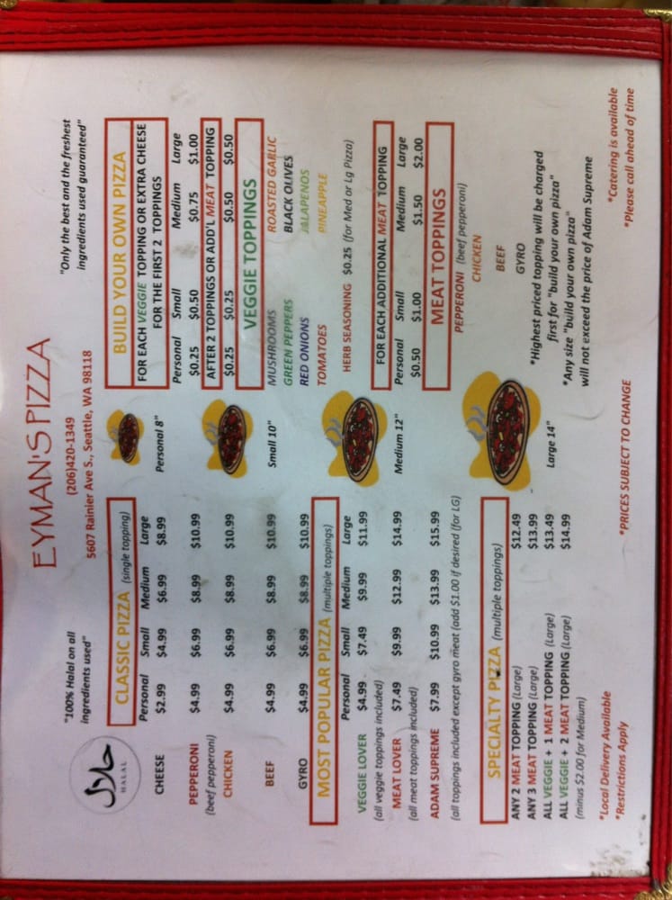 Welcome to Eyman's Pizza, a hidden gem in Seattle offering delectable halal pizza that caters to all tastes. Nestled on Martin Luther King Jr Way S, this family-owned establishment prioritizes quality and flavor, making it a must-visit for pizza enthusiasts.